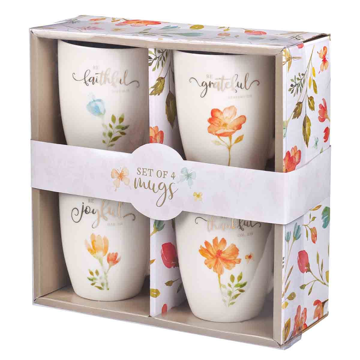 The Grateful Ceramic Mug Set includes four creamy colored ceramic mugs in a beautifully designed floral gift box with see-through lid. Each mug features an encouraging phrase from Scripture, a larger floral design on the front, and a smaller floral accent on the back. The mugs are white on the outside and a light taupe on the inside. Gold foil is used for the lettering.