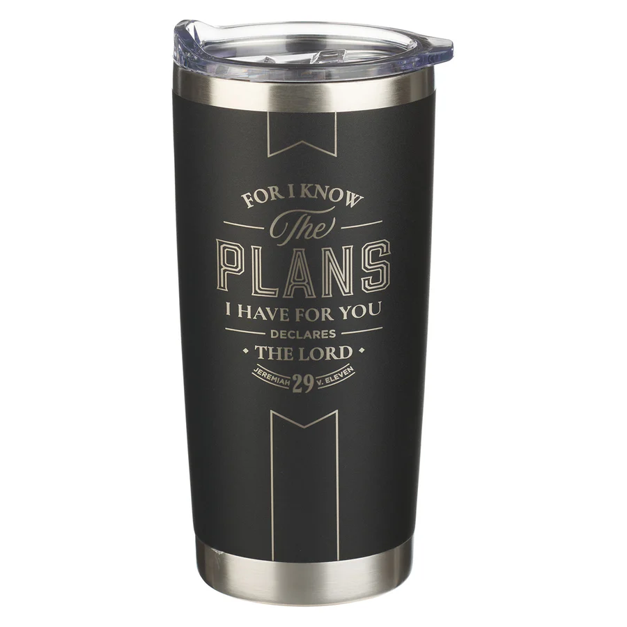 Make a statement of faith using the For I Know the Plans Black Stainless Steel Travel Mug as you move throughout your busy day.