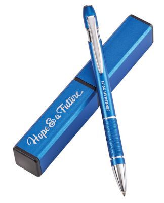 This pen features a cushioned grip for miles of smooth writing, accented by a silver mid-upper barrel clicker. It comes nestled in a compact, rich blue box with silver lettering, “Hope and a Future.” Great for a new graduate, or for an old friend, or anyone in between! This makes a truly practical, elegant, and inspirational gift!